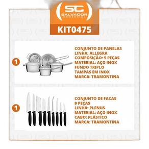 Componentes do kit:1 - jogo de panelas com fundo triplo corpo e tampas em inox 5 pçs - allegra - tramontinacód. 65650280componentes:1 un - panela 1,5 litro allegra13,9cm a x 18cm l x 33,3cm pdiâmetro: 16cmref. 626511601 un - panela 2,20 litros allegra10cm a x 18cm l x 38cm pdiâmetro: 18cmref. 626511811 un - caçarola funda 3,10 litros allegra16,5cm a x 22,2cm l x 27,5cm pdiâmetro: 20cmref. 626542001 un - cozi-vapore 1,7 litros allegra9,2cm a x 18,1cm l x 23,3cm pdiâmetro: 16cmref. 626601611 un - frigideira s/ tampa 1,3 litros allegra6,8cm a x 22,4cm l x 39,9cm pdiâmetro: 20cmref. 62666200- material: aço inox- tampas com encaixe perfeito e saída de vapor- fundo triplo: aço inox + alumínio + aço inox - cozimento rápido com distribuição de calor uniforme- economia de tempo e energia- as alças de inox aquecem durante o cozimento. Aconselhamos o uso de luvas durante o manuseio.- pode ir ao forno em temperatura máxima de 260c- não aqueça o alimento colocando uma panela do mesmo diâmetro sobre a outra.- capacidade volumétrica máxima de cozimento é 3/4 da capacidade total da peçapeso líquido do conjunto: 3,34 kgpeso bruto do conjunto: 3,98 kg1 - jogo facas em aço inox cabo preto cozinha gourmet plenus 9 peças 23498048 tramontinacaracterística e descrição ficha técnica:uso seguro e adequado:- antes da primeira utilização, lave bem as peças e seque-as.- produto cortantes e perfurantes, tenha cuidado e mantenha sempre fora de alcance das crianças.- para maior durabilidade dos produtos, recomenda-se secar bem antes de guardar, mesmo após lavagem em máquinas.- para descarte dos produtos e embalagem, siga as orientações de reciclagem vigentes.Conteúdo:- 1 faca lâmina 7,6cm para tornear torneia, descasca e esculpe frutas e verduras - 1 faca lâmina 7,6cm para legumes ideal cortar, descascar e fazer cortes delicados - 1 faca lâmina 12,7cm para churrasco e frutas com fio serrilhado para corte de carne cozidas e frutas. Não necessita reafiação - 1 faca lâmina 12,7cm para tomates a lâmina micro serrilhada rompe e pela do tomate sem amassar - 1 faca lâmina 12,7cm para desossar ideal para separar a carne dos ossos e tirar a gordura - 1 faca lâmina 12,7cm santoku ideal para cortar, fatiar e picar - 1 faca lâmina 17,8cm pão a lâmina serrilhada corta sem amassar - 1 faca lâmina 17,8cm chef toda versatilidade da protagonista da cozinha - 1 faca lâmina 12,7cm cutelo ideal para quebrar e separar os ossos - lâmina em aço inox, maior resistência a desgaste por fricção, raspagem- fácil manuseio e limpeza sempre cuidando com navalha e pontas - 9 facas por embalagem.- peso líquido: 1,5 kg- peso bruto: 1,65 kgespecificação da embalagem do kit:peso bruto: 5,65 kgmedida embalagem: 13cm a x 45cm l x 59cm p.
