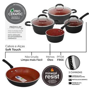 Esse conjunto de panelas é composto por duas caçarolas, duas panelas com cabo e uma frigideira, todas em alumínio preto fosco com revestimento cerâmico na cor vermelha marble. As peças têm espessura de 5mm na borda e 2,2mm no fundo, o que garante que a temperatura seja dissipada de maneira uniforme, evitando que a comida queime facilmente.