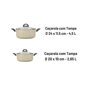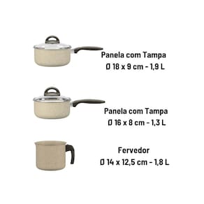 As panelas contam com revestimento Pro Ceramic Premium antiaderente Mineral Resist, o que torna o preparo de pratos mais saudável, pois cozinha com menos óleo, e a limpeza mais prática. A colher e a espátula em silicone não são abrasivas, suportam altas temperaturas e impedem o acúmulo de bactérias.
