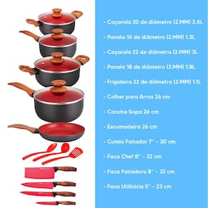O kit é completo, incluindo panelas, frigideira, utensílios de silicone e um jogo de facas de alta precisão, compatível com todos os tipos de fogão, inclusive indução.