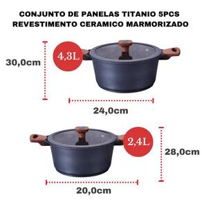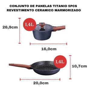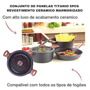 Descrição:Conjunto panelas 10 peças Titanium para Fogão Indução Revestimento Cerâmico Marmorizado. O conjunto de panelas 10 peças Titanium, o seu material é de alumínio injetado de 5 mm de espessura, tampas de vidro temperado com anel de silicone com cabos em soft-touch e também é compatível com todos os tipos de fogões. Um design diferenciado que você só encontra com a MTA. Revestimento Cerâmico Marmorizado de alta performace.Itens Inclusos:2 Panela N16 - 1,4L2 Caçarola N20 - 2,4L2 Caçarola N24 - 4,3L2 Frigideira Alta N20 - 1,1L2 Frigideira Alta N24 - 1,9L Instruções de uso: - Antes de usar, lave e enxugue a suas panelas por completo. - Não coloque a peça vazia para aquecer. - Ao utilizar a peça em fogão a gás, a chama não deve ultrapassar a base, em fogões elétricos ou vitro-cerâmicos, o diametro da boca deverá ser igual ou inferior ao do fundo da peça. Isso evita que o alimento queime. Limpeza e conservação: - Para manter o brilho da seu jogo belga, lave somente com uma esponja macia, detergente ou sabão neutro. Não use lã de aço ou outros abrasivos - Para mexer ou retirar os alimentos use utensilios de silicone, nylon, polipropileno ou madeira. Não use objeatos pontiagudos, não raspe e não corte o alimento dentro da peça, para não riscar. - Evite água com excesso de cloro, para evitar manchas. - Deixe a peça esfriar antes de lavar em água fria. Isso facilita a limpeza - Caso a comida quieime, deixe a peça esfriar e coloque-a de molho em água por alguns minutos antes de lavar.