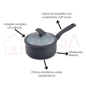 Jogo de Panelas Hercules Revestimento Ceramico Indução 4 Peças Antiaderente Cinza Descrição: A linha Soft Touch da Hercules garante melhor desempenho, funcionalidade e qualidade para a sua cozinha e no preparo das refeições. Com revestimento antiaderente cerâmico. Produzida com materiais resistentes: Alumínio, silicone, vidro e baquelite. Ideal para uso em fogão convencional, fogão halogênio e de indução. Não utilizar no forno, micro-ondas, geladeira e freezer. Sua cozinha pode ser prática, saudável e muito bonita. As panelas da Hércules oferecem o que há de mais moderno para o preparo das refeições diárias. Características: Espessura de 3 milímetros, tampa de vidro com acabamento em silicone, além de muito bonita causa impressão de sofisticação na cozinha. Os cabos em silicone soft touch dão maciez e estabilidade no manuseio da panela além de serem isotérmicos e não esquentarem. O Interior antiaderente em cerâmica facilita o preparo e a limpeza além de não liberar componentes tóxicos na preparação dos alimentos, a construção da panela com fundo especial possibilita sua utilização. - Pode ir em lava-louças; - Pode ir em fogões por indução; - Material Panelas, frigideira e caçarolas : Alumínio, Silicone, Vidro e Baquelite. Composição: Quantidade 4 Peças; 1- Caçarola 20 x 9 cm - espessura 3mm - 2.5L; 1- Panela 18 x 9 cm - espessura 3mm - 1.75L; 1- Panela 20 x 9 cm - espessura 3mm - 2.5L; 1- Frigideira 20 x 5cm - espessura 3mm - 1.2L; Especificações: Marca: Hércules; Modelo: Soft Touch; : 3 meses. Marca: Não Informado
