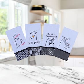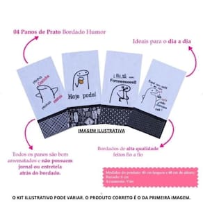 Adicione diversão à sua cozinha com nossos Panos de Prato Bordado Coleção Humor Flork Bentô. Personalidade única, sacaria pé de galinha e muito bom humor em cada peça. Transforme sua rotina culinária com estilo Características do produto: - Conteúdo: 04 Panos de prato, medindo 48cm de largura x 68cm de comprimento cada pano; Composição: - 100% Algodão e sacaria pé de galinha, para garantir qualidade e proporcionar suavidade ao toque e máxima absorção; Estampas do Barrado: - Cada kit é único, com bordados minimalistas do inconfundível Meme Bento Florks adicionando um toque de humor único, podendo apenas variar as estampas do barrado como: poá, xadrez ou chevron preto e branco, barrado sendo com 8cm, enviado conforme nosso ; Acabamento: - Detalhes cuidadosos com overloque; Decoração e Funcionalidade: - Além de decorar, esses panos de prato são feitos de tecido 100% algodão e sacaria pé de galinha, garantindo máxima absorção e eficiência ao secar.