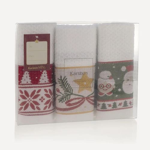 Jogo Pano de Prato Natalino 3 peças 46cmx65cm Karsten O kit Natalino, com três panos de copa, une a funcionalidade do tecido felpudo de alta absorção à beleza das barras decorativas em jacquard. O algodão confere maciez e resistência, tornando a secagem mais rápida e eficiente. Com desenhos festivos e embalagem especial, é ideal para presentear ou renovar o enxoval da cozinha e com um toque natalino que inspira boas memórias. Conta com tag especial para tornar o presente ainda mais significativo. Praticidade e design junto: Na cozinha, cada detalhe conta uma história. O pano de copa, aliado indispensável, é presença constante nos gestos que tornam o cotidiano mais leve e afetuoso. Ele participa dos preparos, acompanha receitas de família e empresta cor e textura ao ambiente. Feitos com o toque do algodão, oferecem alta absorção, maciez e resistência para acompanhar o uso diário. Seu design vai além da utilidade, trazendo estampas, barras decorativas e acabamentos diferenciados, que acrescentam um toque de charme ao ambiente. Além de ser um utensílio, é um item versátil que une beleza e funcionalidade para tornar cada tarefa na cozinha mais prática e agradável. Natal: Natal é a época perfeita para transformar lembranças em momentos de união e aconchego, e cada detalhe da sua casa pode fazer parte dessa magia. O sofá se aquece com mantas macias e almofadas decorativas que abraçam, a mesa ganha vida com toalhas elegantes e guardanapos bordados, e a cozinha se enche de charme com panos de copa e jogos presenteáveis. Cada produto foi pensado para valorizar suas tradições, acolher sua família e criar novos capítulos de histórias que serão lembradas com carinho. A linha Natal tem produtos para preparar sua casa para receber quem você mais ama ou mesmo para presentear com significado. Estar juntos é o que torna tudo mágico.