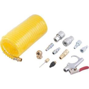 Conteúdo da embalagem1 Jogo para ar comprimido, composto por 14 peças, sendo: 1 mangueira espiral em poliuretano + polietileno (diâmetro interno: 5 mm, diâmetro externo: 8 mm, comprimento: 5 m, com conectores em latão rosca 1/4" NPT (externa - macho) nas extremidades e molas de aço bicromatizado), 1 bico para encher pneus em latão polido (rosca 1/4? NPT (interna - fêmea)), 1 bico para encher bolas e 1 adaptador para bico de encher bolas em aço zincado (rosca 1/8? NPSM (externa - macho)), 1 bico para limpeza em latão polido com ponta emborrachada (rosca 1/8? NPSM (externa - macho)), 2 engates rápidos em aço zincado com rolete (rosca 1/4? NPT (interna - fêmea)), 2 conectores macho para engate rápido em aço zincado (rosca 1/4? NPT), 2 conectores fêmea para engate rápido em aço zincado (rosca 1/4? NPT), 1 adaptador macho-macho em aço bicromatizado, rosca 1/4? NPT, 1 adaptador fêmea-fêmea em aço bicromatizado, rosca 1/4? NPT, 1 bico/pistola de limpeza com corpo em alumínio e gatilho metálico com ponta plastificada (comprimento: 35 mm, rosca de entrada: 1/4" NPT e rosca de saída: 1/8? NPSM)