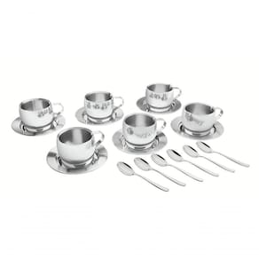 - Totalmente feitas em aço inox, por isso não soltam nenhum resíduo nos alimentos, mantendo-os saudáveis.- Altamente duráveis, mantêm as características , preservando a beleza, a higiene e a durabilidade do material.- Acabamento em brilho.- Próprias para o uso diário, combinam com qualquer ambiente.- Versatilidade e beleza Na hora de servir.- As xícaras possuem paredes duplas, o calor da bebida não passa para a parte externa.- Podem ser lavadas, diariamente, na máquina de lavar louças. Ean: 7891116000281