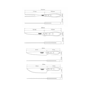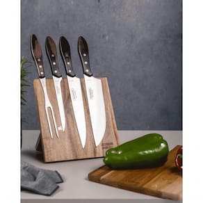 Lâminas de aço inox. As lâminas das facas têm maior durabilidade do fio devido ao tratamento térmico. A lâmina do garfo conta com maior espessura e uma estampagem do aço que garante maior resistência, evitando deformações. Os cabos de madeira tratada Polywood são resistentes à impactos e alta temperaturas garantindo maior resistência e durabilidade. Rebites de alumínio. Suporte de madeira magnético. Podem ir à máquina de lavar louças facilitando seu dia a dia.