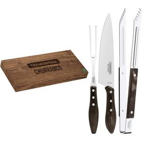 O churrasqueiro é sempre o último a sentar à mesa. Mas para garantir que os convidados também tratem o churrasco com respeito, nada melhor do que escolher os talheres certos para isso. A linha Churrasco da Tramontina possui 3 peças, cabos de madeira Polywood, que resistem ao tempo e a umidade e lâminas em aço inox para garantir o corte perfeito das carnes. Este kit é tudo que você precisa para seu churrasco poder apresentar muito estilo e sabor, sempre garantindo precisão, funcionalidade, beleza e a clássica qualidade da Tramontina que você com certeza já conhece. Características: Marca: Tramontina Código do Fabricante: 29899265 Linha: Churrasco Cor: Madeira Material das Lâminas: Aço inox Material dos Cabos: Madeira Polywood Conteúdo: 1 Faca para Carne 8, 1 Garfo Trinchante e 1 Pegador de Carne Compatível com Lava-louças: Sim Ean: 7891112312067