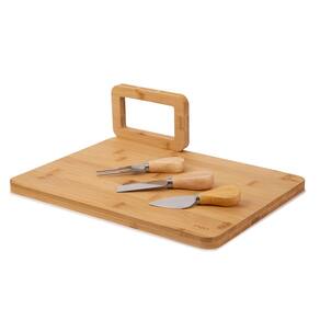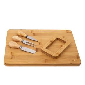 Conjunto composto por quatro peças: uma tábua de bambu, uma faca para queijo, uma espátula e um garfo, proporcionando as ferramentas essenciais para cortar e servir queijos com facilidade.