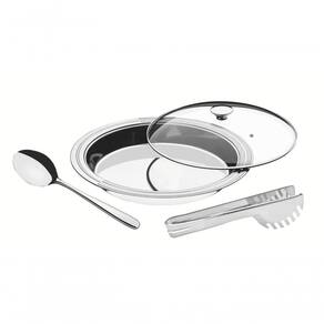 - Utensílio totalmente feito em aço inox, altamente durável e de fácil limpeza.- Proporciona um requinte ao compor a mesa.- Peça com acabamento do aço em brilho e detalhes em alto relevo fosco nas bordas, própria para o uso diário, combinando com qualquer ambiente.- Possui Tampa de vidro temperado. Ean: 7891116083116