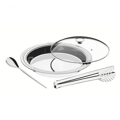 - Utensílio totalmente feito em aço inox, altamente durável e de fácil limpeza.- Proporciona um requinte ao compor a mesa.- Peça com acabamento do aço em brilho e detalhes em alto relevo fosco nas bordas, própria para o uso diário, combinando com qualquer ambiente.- Possui Tampa de vidro temperado. Ean: 7891116083697