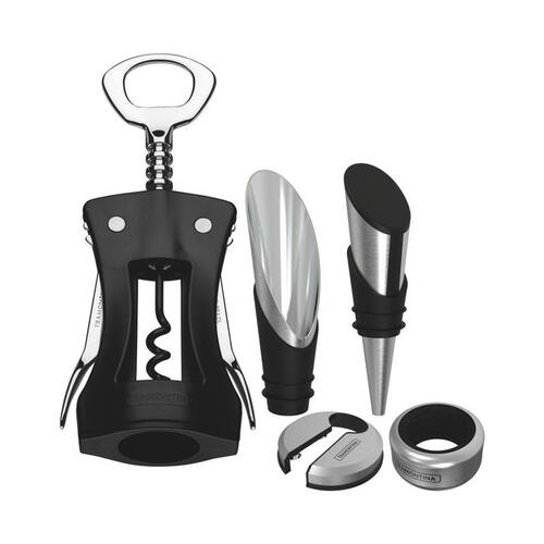 Servir amigos com um bom vinho nunca foi tão fácil E com Jogo para Vinhos Tramontina Harmoniza 5 Peças você nunca mais irá ter dificuldades na hora de servir seu vinho predileto. Ele possui um Abridor/ Sacarolhas, um anel salva gotas e um Corta gotas para você não ter que se preocupar com acidentes à mesa; além de um prático Corta lacres e da tampa para garrafas de vinho que vai fazer você nunca perder nada de sua bebida favorita. As ocasiões especiais em sua casa nunca foram tão práticas. Espiral de aço com revestimento antiaderente. Tampa de aço inox e nylon com anel de silicone. Corta gotas de aço inox com emborrachado. Corta lacres de aço inox e ABS. Salva gotas de aço inox com feltro interno. Tenha cuidado ao manusear produtos tantes e perfurantes e mantenha fora do alcance das crianças. Realize a limpeza manualmente com detergente neutro, água e esponja macia. Sequeo imediatamente após a limpeza com um pano seco. Não utilize a tampa ou ta gotas com o anel rompido/danificado. Para limpeza do salva gotas, retire o feltro do interior do anel e limpe ambas as partes com detergente neutro e água rente. Deixe o feltro secar em temperatura ambiente e seque imediatamente o anel. Para descarte do produto e embalagem, siga as orientações de reciclagem vigentes. EAN13: 7891112264595 DUN14: 17891112264592 NCM: 8205.51.00 Peso Líquido: 0,2800 kg. Peso Bruto: 0,4050 kg. Metragem: 0,002115 m. Dimensões Embalagem Compr. X Larg. X Alt. : 200x 45x 235 mm.