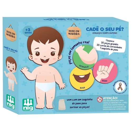 Neste jogo, a criança sorteia uma peça e identifica a parte no seu corpo. Agora ela vai posicionar a peça em cima do boneco, uma de cada vez. Acompanha cartas com curiosidades, que podem se transformar em um jogo da memória: os pares serão formados com 01 carta e 01 peça de madeira. Estimula o aprendizado sobre o corpo humano e a Criatividade O Cadê o Seu Pé em madeira da Nig Brinquedos é um produto com grande potencial, unindo a beleza e durabilidade da madeira com importantes aspectos do desenvolvimento infantil. É um brinquedo projetado e desenvolvido para que todas as crianças, independentemente de suas habilidades físicas, sensoriais, cognitivas ou sociais, possam brincar juntas e se divertir. O objetivo principal é criar um ambiente de brincadeira onde a diversidade seja valorizada e todas as crianças se sintam incluídas, seguras e capazes de participar plenamente.