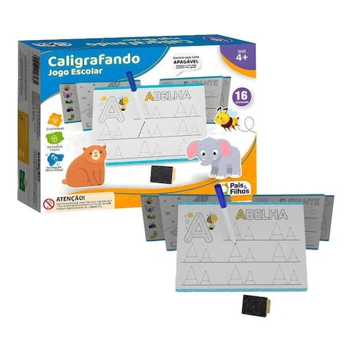 O Jogo Pedagógico Caligrafando da Pais e Filhos é a ferramenta ideal para auxiliar pais e filhos no desenvolvimento da caligrafia de maneira divertida e educativa. Com um quadro branco e palavras como abelha e letras como a, o jogo estimula a escrita correta e a coordenação motora das crianças.