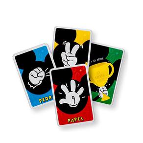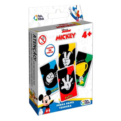 Jogo Pais & Filhos Mickey Pedra, Papel, Tesoura Idade 4+ Com 56 Cartas ? Agora a brincadeira de Pedra, Papel e Tesoura ganhou uma versão divertida em jogo de cartas infantil. O jogador precisa ser rápido nas disputas para identificar entre as cartas qual dos símbolos é o vencedor. Com os gestos corretos com a mão o jogador vai acumulando as cartas. Vence quem tiver mais cartas no final da partida. Um jogo que vai estimular o raciocínio lógico e coordenação motora da criançada enquanto eles se divertem!