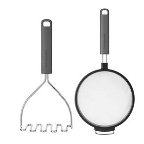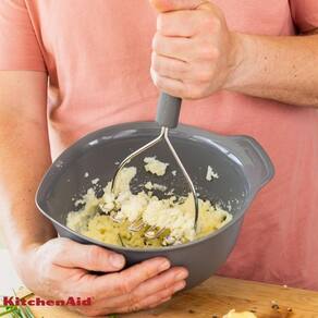 O amassador de batatas garante purês lisos e vegetais amassados com facilidade, com cabeça robusta em aço inox resistente à ferrugem.