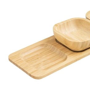 O jogo de petisqueira Bambus medindo 33 cm x 13 cm é produzida 100% em bambu, conta com 4 peças, sendo uma base que encaixa perfeitmente os três recipientes para petiscos, possibilitando servir diferentes porçoes de petiscos de uma vez.