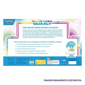 Comece uma nova jornada com quaxly e seus amigos Prepare-se para uma aventura totalmente nova na região de paldea com o pokémon estampas ilustradas Os parceiros iniciais sprigatito, fuecoco e quaxly juntam-se à sua coleção como cartas holográficas promocionais, e o broche brilhante de quaxly permite que você exiba o pokémon patinho onde quer que você vá. Descubra muito mais com incríveis pacotes de booster e uma carta extragrande de um dos pokémon lendários, koraidon ou miraidon, como um poderoso pokémon ex Esta coleção paldea do pokémon estampas ilustradas contém: - 3 cartas holográficas promocionais de sprigatito, fuecoco e quaxly - 1 carta holográfica extragrande de koraidon ex ou miraidon ex - 1 broche de colecionador de quaxly - 6 pacotes de booster do pokémon estampas ilustradas - 1 carta codificada para o pokémon estampas ilustradas live. - contém 39 unidades de cartas no formato 63mm x 88mm e 1 unidades de carta no formato 133mm x 187mm.. - registro 008140/2021