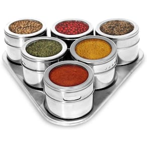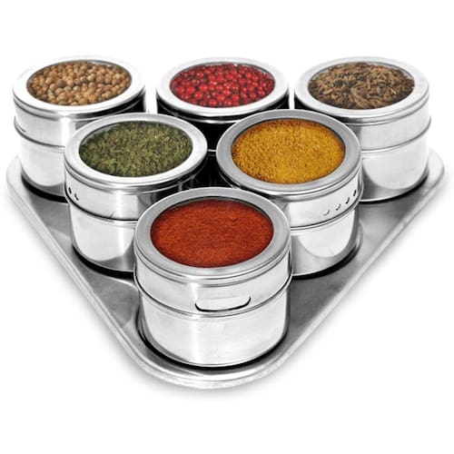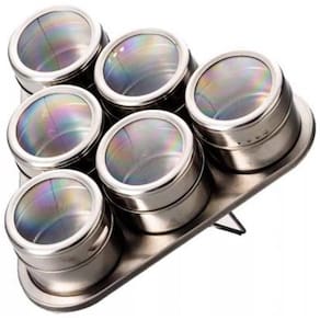 Características: Porta temperos com 6 potes magnéticos e base inclinada em aço inox. Moderno, ideal para organizar a sua cozinha ocupando pouco espaço. Agora ficou fácil ter uma cozinha com um toque Gourmet Potes com tampas de 2 saídas para o tempero: Uma larga e uma com orifícios. Possui visor transparente para fácil identificação dos temperos. Imã na base dos potes para fixação em superfícies metálicas. Temperos e condimentos não acompanham o produto. 6 potes em aço inox e base magnética 1 base em aço inox Dimensões do pote: 6cm de diâmetro e 4cm de altura cada Capacidade do pote: 75ml cada Dimensões da base: Triangular de 20cm Conteúdo: 6 potes em aço inox e base magnética 1 base em aço inox 1 suporte da base Ean: 7898545640859
