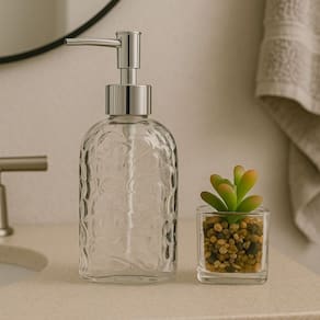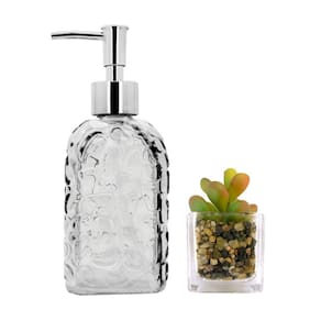 Conjunto para Banheiro em Vidro Texturizado Clear Bolhas – Porta Sabonete Líquido 500ml + Mini Vaso Decorativo com Suculenta Artificial