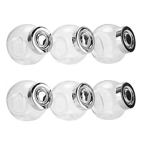 O jogo de 6 potes de vidro possui aproximadamente 200ml de capacidade, 8cm de altura e 6cm de largura. O pote é feito em vidro e possui uma tampa de rosca feita em plástico na cor prateada. Ideal para armazenar temperos, guloseimas ou até mesmo para servir de enfeite com muita elegância.