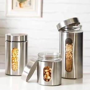 Buscando 03 Itens elegantes e modernos para compor sua cozinha Com um design minimalista e imponente o Conjunto de Potes para Mantimentos em aço inox é ideal