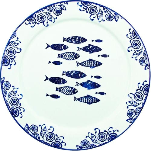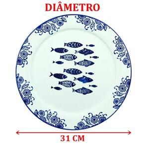 Uso: Resistente a micro-ondas, Resistente a lava-louças; Material: Cerâmica; Formato: Redondo; Decoração: Estampado; Cores: Azul, Branco; Diâmetro: 31cm; Conteúdo da embalagem: