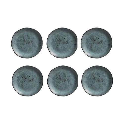 Marca: Porto Brasil Cerâmica; Linha: Orgânico Petroleum; Material: Stoneware; Cor Predominante da Base: Preto; Composição: 6 Pratos; Dimensões do Produto:Ø19.1cm A = 2.3cm Dimensões da Embalagem: C=27,3cm x L=11cm x A=22.6cm