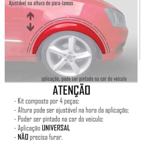 Descrição:Para se libertar do comum, nosso aro protetor alargador de para-lamas traz uma dose extra de estilo. Seu design arrojado feito com material de polipropileno resistente, certamente deixará uma impressão duradoura na personalização do seu carro. Nossa versão é universal. Atenção: aconselhamos testar a peça no veículo antes da instalação não instale antes de ler as instruções. Características:- flexível e muito resistente;- somente na cor preto fosco, poder ser pintado na cor do veiculo;- fácil instalação;- fabricado em polipropileno pp ;- aplicável com fita dupla face;- modelo universal. Contéudo da caixa:- 2 pares dianteiro- 2 pares traseiro- kit de instalação e adesivos. Possíveis carros compatíveis:- gol- voyage- up- polo- virtus- jetta- t-cross- taos- passat- polo- corolla- yaris- etios- onix- cruze- cobalt- corsa- celta- astra- agile- meriva- vectra- zafira- hb20- creta- tucson- march- kicks- sentra- palio- punto- argo- uno- cronos- captur- sandero- logan- duster- renegade- compass- focus- ecosport- fiesta- novo ka- master- jumpy- scudo- expert- ducato- boxer