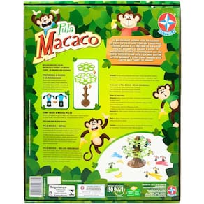 Idade recomendada: a partir de 4 anos Número de jogadores: para 2 a 4 jogadores Objetivo do jogo: conseguir acertar mais macaquinhos na árvore Tempo médio de jogo: 20 minutos Contém na embalagem: 1 tronco, 2 copas, 4 'lanças-macacos', 16 macaquinhos, 16 bananas de cartão e folha de adesivos