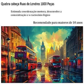 Jogo quebra cabeça puzzle 1000 peças nas ruas de londres ----loja oficial do click compras na internet---- Somos um dos melhores vendedores do site, nossa missão é atender com amor e carinho nossos clientes, oferecendo sempre o melhor atendimento e produtos de excelência. São milhares de produtos entregues e clientes satisfeitos. ----loja oficial do click compras na internet---- O kit compõe todas as peças da foto principal Produto em Descubra a mágica de londres peça por peça com este desafiante quebra-cabeça de 1000 peças, capturando a essência das suas icônicas ruas. Cada peça é uma jornada pela arquitetura elegante e a atmosfera vibrante que torna londres única. Perfeito para os amantes da cidade e entusiastas de quebra-cabeças, este puzzle é uma celebração da riqueza histórica e da modernidade dinâmica que define a capital britânica. Especificações: -medida do quebra-cabeça montado: 72cm de largura x 52cm de altura Homologação Inmetro: 09238-35/2021