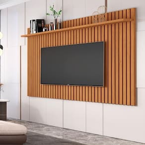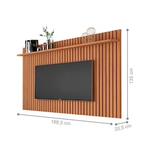 O painel conta com uma prateleira para acomodar os objetos decorativos, plantas, livros , videogames e aparelhos de . possui um design elegante com os seus detalhes ripados em alto relevo