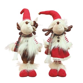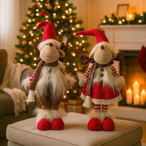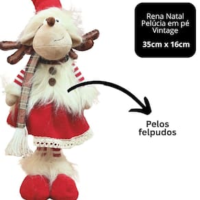 Transforme sua decoração natalina com este charmoso casal de renas decorativas em pelúcia, perfeitas para trazer aconchego e estilo retrô ao ambiente. Com 55cm de altura (considerando a medição até a ponta do gorro em pé) e 16cm de largura, cada rena apresenta um visual vintage encantador, com roupas listradas nas cores vermelho, branco e marrom, cachecol xadrez, gorrinho vermelho com guizo e delicados detalhes em pelo branco felpudo.