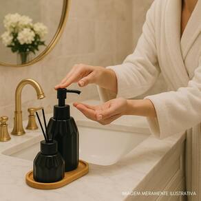 Kit Lavabo Luxo em Porcelana e Bambu Transforme seu banheiro em um ambiente ainda mais sofisticado e acolhedor com este kit lavabo em porcelana. O design elegante, aliado à praticidade, traz harmonia para a decoração, enquanto a bandeja em bambu adiciona um toque natural e refinado. Perfeito para impressionar visitas e deixar sua rotina mais especial, este kit une funcionalidade e charme em cada detalhe. Seja no lavabo, no banheiro social ou no home spa, ele é o complemento ideal para quem valoriza beleza e organização. Especificações Técnicas Material dos frascos: Porcelana de alta qualidade, resistente e fácil de higienizar Material da bandeja: Bambu natural, acabamento liso e sofisticado Capacidade individual: Porta-Sabonete Líquido: 260 ml Frasco Difusor: 130 ml Quantidade de peças: Kit com 3 peças 1 Porta-Sabonete Líquido 1 Frasco Difusor 1 Bandeja de Bambu oval Imagens ilustrativas.