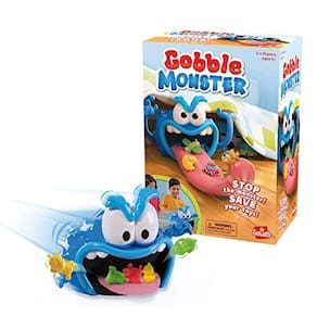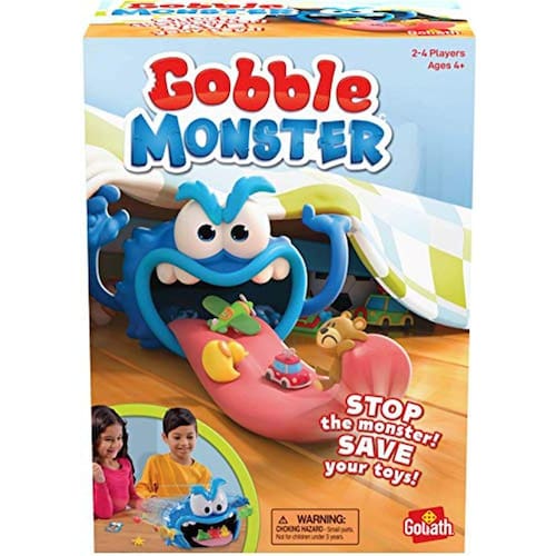 PRODUTO INTERNACIONAL. Uh, oh! Seus brinquedos estão em perigo! O Monstro do Gobble quer comê-los e você e seus amigos são os únicos que podem impedi-lo! Com o divertido jogo Monstro do Gobble, cada jogador sorteia uma carta para descobrir qual brinquedo deve ser salvo em seguida.