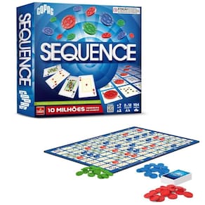 Está disposto a fazer tudo o que for preciso para sua equipe ganhar? Sequence é um jogo emocionante, com milhões de unidades vendidas em todo o mundo. Com o Jogo de Tabuleiro Sequence da Copag, a diversão está garantida. O objetivo do jogo é criar uma sequência que poderá ser uma linha horizontal, vertical ou diagonal ininterrupta de 5 fichas da mesma cor.