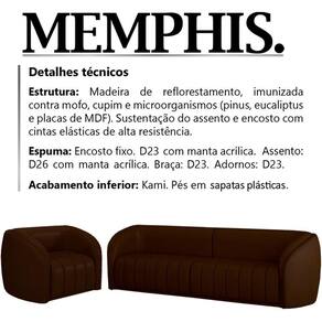 Jogo Sofa 332 cm 4 Lug E Poltrona 1 Lug Memphis Corano, uma ótima opção para quem busca por um ambiente elegante e cheio de personalidade. Estrutura em madeira de reflorestamento (pinus, eucaliptos e placas de MDF) e cintas elásticas de alta resistência. Sofá e Poltrona compostos por madeira imunizada contra mofo, cupim e microrganismos, revestimento em tecido corano, encosto fixo em espuma D-23 com manta acrílica, assento em espuma D-26 com manta acrílica, braça em espuma D-23, adornos em espuma D-23, acabamento inferior em kami, acompanha sapatas plásticas. Suportando até 130 kg por assento. Unindo elementos do design contemporâneo, que proporcionam uma ambientação intimista e com acabamentos refinados, assim se ostenta o exuberante kit Memphis. Estes móveis chegarão na sua casa separado em 03 volumes.
