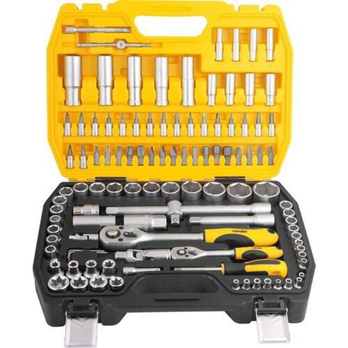 1 Jogo de soquetes e ponteiras, composto por: 1 maleta plástica, 13 soquetes sextavados encaixe 1/4" (4 mm, 4,5 mm, 5 mm, 5,5 mm, 6 mm, 7 mm, 8 mm, 9 mm, 10 mm, 11 mm, 12 mm, 13 mm e 14 mm), 17 soquetes sextavados encaixe 1/2" (10 mm, 11 mm, 12 mm, 13 mm, 14 mm, 15 mm, 16 mm, 17 mm, 18 mm, 19 mm, 20 mm, 21 mm, 22 mm, 24 mm, 27 mm, 30 mm e 32 mm), 5 soquetes hexalobular fêmea encaixe 1/4" (4 mm, 5 mm, 6 mm, 7 mm e 8 mm), 8 soquetes hexalobular fêmea encaixe 1/2" (10 mm, 11 mm, 12 mm, 14 mm, 16 mm, 18 mm, 20 mm e 24 mm), 1 catraca encaixe 1/4", 1 catraca encaixe 1/2", 1 prolongador grande encaixe 1/4", 1 prolongador grande com cabo T encaixe 1/2", 1 cabo T encaixe 1/4", 1 prolongador pequeno encaixe 1/4", 1 prolongador médio encaixe 1/2", 1 adaptador tipo joelho encaixe 1/4", 1 adaptador tipo joelho encaixe 1/2", 2 soquetes para vela (16 mm e 21 mm ), 1 cabo adaptador com cabo plástico encaixe 1/4", 3 chaves allen (1,5 mm, 2 mm e 2,5 mm), 8 soquetes sextavados longos encaixe 1/4" (6 mm, 7 mm, 8 mm, 9 mm, 10 mm, 11 mm, 12 mm e 13 mm), 5 soquetes sextavados longos encaixe 1/2" (14 mm, 15 mm, 17 mm, 19 mm e 22 mm), 1 adaptador encaixe 1/2" para bits 5/16?, 3 soquetes bits fenda encaixe 1/4" (4 mm, 5,5 mm e 6,5 mm), 2 soquetes bits phillips encaixe 1/4" (PH1 e PH2), 2 soquetes bits pozidrive encaixe 1/4" (PZ1 e PZ2), 7 soquetes bits hexalobular encaixe 1/4" (T8, T10, T15, T20, T25, T27 e T30), 4 bits sextavado interno encaixe 1/4" (3 mm, 4 mm, 5 mm e 6 mm), 3 bits fenda encaixe 5/16? (8 mm, 10 mm e 12 mm), 5 bits sextavado interno encaixe 5/16? (7 mm, 8 mm, 10 mm, 12 mm e 14 mm), 5 bits hexalobular encaixe 5/16? (T40, T45, T50, T55 e T60), 2 bits pozidrive encaixe 5/16? (PZ3 e PZ4) e 2 bits phillips encaixe 5/16? (PH3 e PH4)