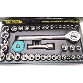 Jogo de soquetes sextavados para uso em geral amador e profissional. Indicado para apertar e soltar parafusos e porcas em milímetros 4mm até 13mm e polegadas 5/32 até 9/16. Vem muito bem organizado em uma maleta de pvc contendo 40 peças no total, entre elas, 1 catraca, 1 extensor prolongador, 1 adaptador de 1/4 para 3/8 e disco. Leve, prático e indispensável para sua oficina seja ela em casa como hobby ou de uso profissional. São 14 soquetes 1/4, 4,0mm, 4,5mm, 5,0mm, 5,5mm, 6,0mm, 6,5mm, 7,0mm, 7,5mm, 8,0mm, 9,0mm, 10,0mm, 11,0mm, 12,0mm, 13,0mm. São + 14 soquetes de 1/4 com bitolas 5/32, 3/16, 7/32, 1/4, 9/32, 5/16, 11/32, 3/8, 13/32, 7/16, 15/32, 1/2, 17/32, 9/16, 03 soquetes 1/4 de bitolas 1/4, 5/16, 3/8, 02 soquetes 3/8 de tamanhos 14,0mm, 15,0mm, 02 soquetes 3/8 de bitolas 5/8, 11/16.