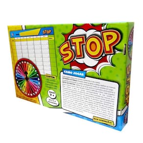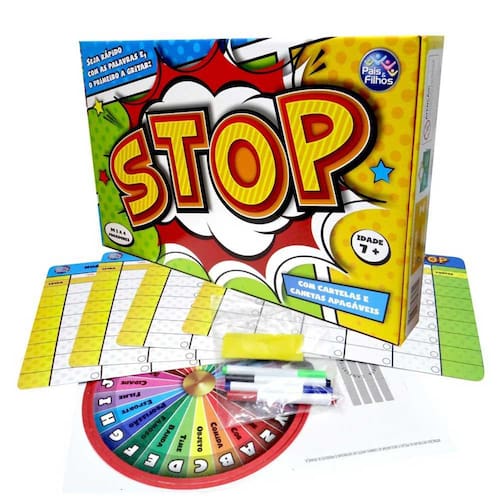Jogo Stop - Pais e Filhos Toda criança gosta de brincar de Stop. Agora esse tradicional jogo ficou mais fácil e divertido. O Stop - Pais e Filhos contém cartelas e canetas apagáveis para as crianças brincarem quantas vezes quiserem. Basta passar o apagador sobre a tinta e a cartela está pronta para ser usada novamente. Jogo Stop - Pais e Filhos é acompanhado de uma roleta cartonada, 4 cartelas cartonadas, 4 canetas dry erases e 4 apagadores (felty). Seja rápido com as palavras e o primeiro a gritar: Stop! Detalhes especiais Jogo de Stop Infantil - Pais e Filhos: Cartelas cartonadas Canetas e Cartelas apagáveis De 2 a 4 jogadores Estimula a socialização Indicado para crianças a partir de 7 anos de idade Jogo Stop - Pais e Filhos, como jogar? - Cada jogador pega uma cartela e preenche o seu nome. Definindo os temas: - Primeiro, deve-se girar a roleta e definir os 5 temas da partida, escrevendo na ordem sorteada em todas as cartelas em jogo. Início da partida: - Define-se na sorte quem é o primeiro participante a girar a roleta e assim o faz. - Girada a roleta e definida a letra, cada jogador deve colocar a letra no campo correspondente na sua cartela e imediatamente escrever as palavras com a letra anotada nas colunas com os temas pré-definidos no início. - Os participantes devem tentar preencher as 5 palavras correspondentes aos temas. O primeiro que completar as palavras deve dizer em voz alta: "STOP". - Assim, os jogadores devem parar de escrever na mesma hora. Então, cada jogador lê em voz alta sua palavra do "tema 1". Se sua palavra for única, o jogador anota 10 pontos. - Se mais alguém escreveu, cada jogador anota 5 pontos. Se a coluna não foi preenchida por algum motivo, anota-se 0 (zero) ponto e assim verifica-se todos os cinco temas. - Encerrada a rodada, o próximo participante gira a roleta e define-se a próxima letra e repete-se a jogada. - Vence aquele que, no final da cartela, tiver mais pontos. Caraterísticas do produto • Produto: Jogo Stop - Pais e Filhos • Tipo: Jogo de Stop Infantil • Participantes: 2 a 4 Jogadores • Itens inclusos: de uma roleta cartonada, 4 cartelas cartonadas, 4 canetas dry erases e 4 apagadores (felty) • Marca: Pais e Filhos • Dimensões embalagem: aprox. C 37 cm x A 24 cm x L 4,5 cm • Peso embalagem: aprox. 420 g • Certificado: CE-BRI/ICEPEX-l 01883-25 NBR NM 300/2004 • Idade Recomendada: Recomendado para crianças a partir de 7 anos de idade. • Restrição de Idade: Não recomendável para crianças menores de 3 anos por conter peças pequenas que podem ser engolidas ou aspiradas. Benefícios: • O Jogo de Stop Infantil - Pais e Filhos auxilia no desenvolvimento da atenção, concentração, pensamento e raciocínio. Treina a memória e estimula a criatividade dos pequenos. Trabalha a socialização e interação entre as crianças em divertidas disputas. Contribui para o aprendizado, novas descobertas e melhora o vocabulário. Aviso importante: • As imagens são meramente ilustrativas. As cores e estampas dos produtos podem conter variações. As informações são de responsabilidade do fabricante ou fornecedor. Atenção: • Agora que você sabe onde comprar Jogo - Stop Pais e Filhos, que tal aproveitar nossas condições de pagamento? Entregamos em todo o Brasil. Essa oferta é válida por tempo limitado. Produto sujeito a disponibilidade de estoque.