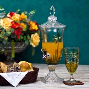 A jarra é uma peça central deslumbrante, ideal para servir água aromatizada, sucos frescos ou até mesmo coquetéis exclusivos em eventos especiais. Sua capacidade generosa permite que você sirva seus convidados com facilidade, enquanto a pintura da palmeira proporciona um toque de encanto tropical à sua mesa.