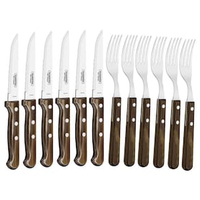 Jogo De Talheres Para Churrasco Polywood Castanho 12 Peças Tramontina - 21198/976 Contéudo: 6 Garfos de Mesa 6 Facas de Churrasco Jumbo Descrição do Produto: O churrasqueiro é sempre o último a sentar à mesa. Mas para garantir que os convidados também tratem o assado com respeito, nada melhor do que escolher os talheres certos para isso. A linha Churrasco da Tramontina tem cabos de madeira, que resistem ao tempo e à umidade, e lâminas em aço inox para garantir o corte perfeito das carnes. Lâminas de aço inox. Cabos de madeira tratada Polywood. Rebites de alumínio. Antes da primeira utilização, lave bem as peças e seque-as. Tenha cuidado ao manusear produtos cortantes e perfurantes e mantenha-os fora do alcance de crianças. Para maior durabilidade dos produtos, recomenda-se secar bem antes de guardar, mesmo após lavagem em máquina. Para descarte dos produtos e embalagens siga as orientações de reciclagem vigentes. Complemento: EAN13: 7891112253384 DUN14: 17891112253381 NCM: 8215.20.00 Peso Líquido: 0,6050 kg. Peso Bruto: 0,7900 kg. Metragem: 0,003176 m Dimensões Embalagem Compr. X Larg. X Alt. : 385x 250x 33 mm. Marca: Não Informado Ean: 7891112253384