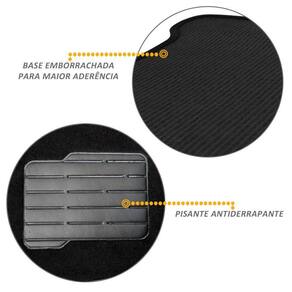 Fabricado em carpete automotivo , material já conhecido pela excelente qualidade e resistência. Além da sua base reforçada para dar mais fixação no assoalho do veiculo.