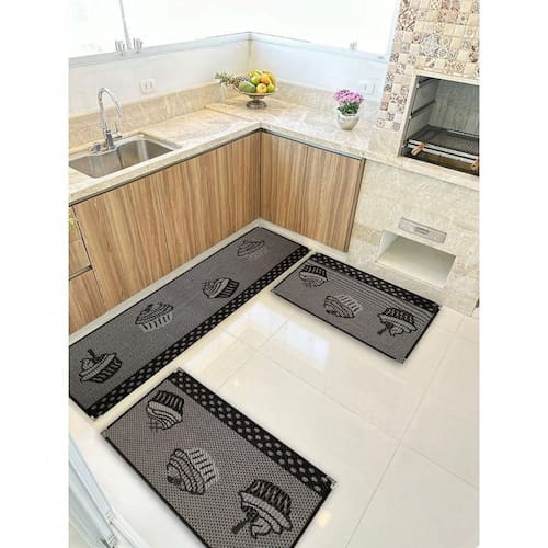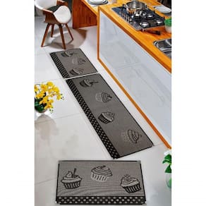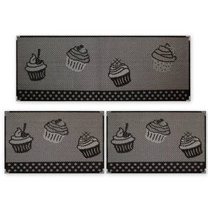 Jogo de Tapetes para Cozinha Sisal Antiderrapante KS-78 Estampa Cupcakes Preto/Cinza Kit com 3 Peças