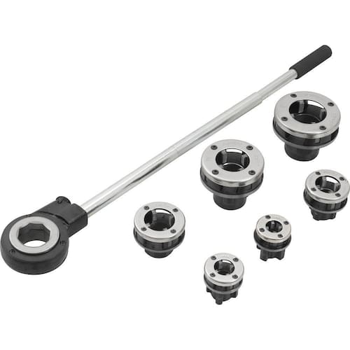 Conteúdo da embalagem 1 Jogo de Tarraxa manual composto por: 1 caixa plástica, 6 tarraxas BSPT 1/2" - 3/4" - 1" - 1.1/4" - 1.1/2" e 2", 1 porta-tarraxa com catraca reversível, cabo com empunhadura e prolongador do cabo Aplicações e dicas de uso Indicada para fazer roscas paralelas em tubos metálicos Destaques e diferenciais Possui tarraxas reforçadas com base em ferro fundido, cossinetes intercambiáveis em aço temperado proporcionando maior resistência e durabilidade. Conta com porta-tarraxas em ferro fundido com sistema de catraca e botão de reversão permitindo selecionar o sentido de trabalho e guia de posicionamento do cano conferindo maior precisão. Possui ainda cabo bipartido, com encaixes roscados, em estrutura metálica tubular com empunhadura emborrachada que proporciona maior conforto no manuseio.