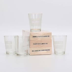 Conjunto inclui 4 copos de vidro e blocos de empilhamento de madeira.