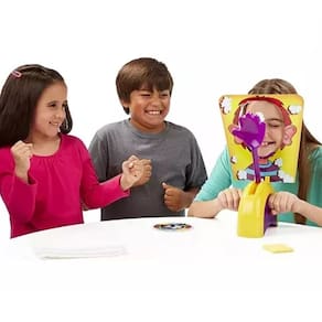 Gire a roleta para saber quantas vezes deve girar a manivela, com o rosto apoiado no card, e torça para não ser atingido pela espuma.