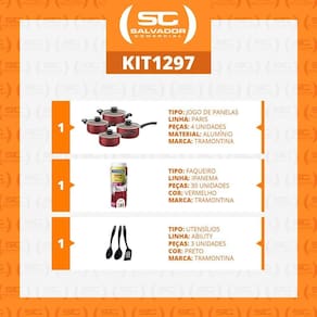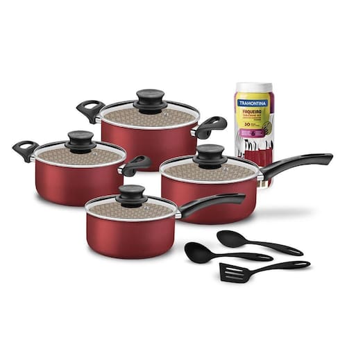 Muito importante: -- conferir produtos no ato do recebimento. Não aceitar produtos com embalagem violada  amassado, rasgado, aberto, quebrado, etc , a recusa deve ser feita no ato. Componentes do kit: - 1 caçarola 18 cm 2,1 l paris - 1 caçarola 20 cm 2,9 l paris - 1 panela 18 cm 2,1 l paris - 1 panela 20 cm 2,9 l paris - 1 faqueiro inox 30pc ipanema vermelho - tramontina - 1 jogo de utensílios ability em nylon preto 3 peças - tramontina 25199011 Jogo de panelas paris 4 peças alumínio antiaderente vermelho patv - tramontina: - corpo de alumínio com espessura que proporciona cozimento rápido e uniforme. - revestimento interno e externo de antiaderente starflon max que não gruda, é fácil de limpar, mais durável e não é prejudicial à saúde, pois é livre de pfoa. - tampas de vidro temperado, com saída de vapor e bordas de aço inox. - cabos, alças de baquelite antitérmico e pegadores de nylon que oferecem segurança durante o manuseio. - podem ir à máquina de lavar louças facilitando seu dia a dia. : 90 dias para vícios ou defeitos de fabricação. Mais informações: - tipo: conjunto de panelas - cor: vermelho - linha: paris - revestimento: antiaderente starflon max - fogão: gás, elétrico, vitrocerâmico - resistência elétrica - máquina de lavar: sim Faqueiro ipanema 30pç vermelho tramontina 23398/788: Descrição ficha técnica: Modelo ipanema 30 peças. Cód. 23398/788 cor vermelho Uso seguro e adequado: - antes da primeira utilização, lave bem as peças e seque-as. - produtos cortantes e perfurantes, tenha cuidado e mantenha sempre fora de alcance das crianças. - para maior durabilidade dos produtos, recomenda-se secar bem antes de guardar, mesmo após lavagem em máquinas. - para descarte dos produtos e embalagem, siga as orientações de reciclagem vigentes. Conteúdo: 6 facas lâmina 11,2cm - medida 21cm 6 garfos de mesa. - medida 19cm 6 colheres de mesa. - medida 19cm 6 garfos para sobremesa. - medida 14cm 6 colheres para chá. - medida 14cm - lâmina em aço inox, maior resistência a desgaste por fricção, raspagem. - fácil manuseio e limpeza  sempre cuidando com navalha e pontas . - 30 pç por embalagem. Jogo de utensílios ability em nylon preto 3 peças - tramontina 25199011: - utensílios de nylon resistentes até uma temperatura de 180 c. - cabos com furo passante possibilitando que sejam pendurados na sua cozinha. - utensílios ideais para uso em panelas com revestimentos antiaderentes e cerâmicos, pois não danifica o produto. - podem ir à máquina de lavar louças facilitando seu dia a dia. : 90 dias para vícios ou defeitos de fabricação. Componentes: - 25156100 - colher para servir ability - 25157100 - concha ability - 25155100 - espátula ability Mais informações: - tipo: jogo de utensílios - quantidade no jogo: 3 unidades - cor: preto - material: nylon - linha: ability - máquina de lavar: sim Dimensões embalagem: 31 cm a x 46 cm l x 30 cm p Peso bruto: 4,75 kg
