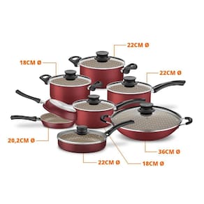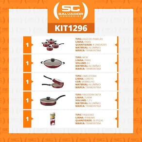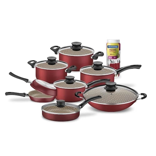Muito importante: -- conferir produtos no ato do recebimento. Não aceitar produtos com embalagem violada  amassado, rasgado, aberto, quebrado, etc , a recusa deve ser feita no ato. Componentes do kit: - 1 jogo de panelas alumínio antiaderente vermelhas 7 peças - tramontina - 1 faqueiro ipanema 30pç vermelho tramontina 23398/788 Jogo de panelas alumínio antiaderente vermelhas 7 peças: - 1 caçarola 18 cm 2,1 l paris - 1 caçarola 20 cm 2,9 l paris - 1 panela 18 cm 2,1 l paris - 1 panela 20 cm 2,9 l paris - 1 omeleteira 20,2 cm loreto - 1 wok 36 cm 6,0 l paris - 1 frigideira 22 cm 1,7 l turim - corpo de alumínio com espessura que proporciona cozimento rápido e uniforme. - revestimento interno e externo de antiaderente starflon max que não gruda, é fácil de limpar, mais durável e não é prejudicial à saúde, pois é livre de pfoa. - tampas de vidro temperado, com saída de vapor e bordas de aço inox. - cabos, alças de baquelite antitérmico e pegadores de nylon que oferecem segurança durante o manuseio. - podem ir à máquina de lavar louças facilitando seu dia a dia. : 90 dias para vícios ou defeitos de fabricação. Mais informações: - tipo: conjunto de panelas - cor: vermelho - revestimento: antiaderente starflon max - fogão: gás, elétrico, vitrocerâmico - resistência elétrica - máquina de lavar: sim Perguntas frequentes: - Sim, , lacrado e de fábrica. - tem Sim, temos produto e na confirmação do seu pedido o produto embarca no mesmo ia  veja detalhes postagem . - qual a . é de 3 meses contra defeito de fabricação. - quantos litros 1 - caçarola - 2,9l 1 - caçarola - 3,8l 1 - fervedor - 1,7l 1 - frigideira reta - 1,7l 1 - frigideira - 0,8l 1 - panela - 1,5l 1 - panela - 2,1l Faqueiro ipanema 30pç vermelho tramontina 23398/788: Descrição ficha técnica: Modelo ipanema 30 peças. Cód. 23398/788 cor vermelho Uso seguro e adequado: - antes da primeira utilização, lave bem as peças e seque-as. - produtos cortantes e perfurantes, tenha cuidado e mantenha sempre fora de alcance das crianças. - para maior durabilidade dos produtos, recomenda-se secar bem antes de guardar, mesmo após lavagem em máquinas. - para descarte dos produtos e embalagem, siga as orientações de reciclagem vigentes. Conteúdo: 6 facas lâmina 11,2cm - medida 21cm 6 garfos de mesa. - medida 19cm 6 colheres de mesa. - medida 19cm 6 garfos para sobremesa. - medida 14cm 6 colheres para chá. - medida 14cm - lâmina em aço inox, maior resistência a desgaste por fricção, raspagem. - fácil manuseio e limpeza  sempre cuidando com navalha e pontas . - 30 pç por embalagem. Peso bruto: 8,9 kg Medida embalagem: 47 cm a x 30 cm l x 48 cm p