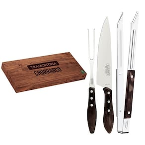 O jogo trinchante Tramontina com lâminas em aço inox e cabos de madeira tratada Polywood castanho 03 peças vai transformar a hora de preparar e servir seu churrasco. Desenvolvidas com lâminas em aço inox e cabos de madeira tratada Polywood com rebites de aço inox, as peças garantem maior durabilidade e resistência, e a faca, um excelente poder de corte, devido ao tratamento térmico. Ele ainda pode ser levado à máquina de lavar louças e vai facilitar a hora de guardar, pois as peças vem em uma linda caixa de papelão litografado!